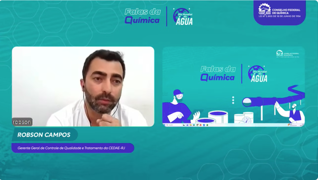O palestrante do painel foi o Gerente Geral de Controle de Qualidade e Tratamento da CEDAE-RJ, Robson Campos, que chamou atenção para a necessidade de ampliar o olhar sobre a atuação do profissional da Química. “A estação de tratamento é, essencialmente, uma indústria de transformação química. Mas o desafio hoje é atuar antes disso, na gestão dos mananciais”, destacou.