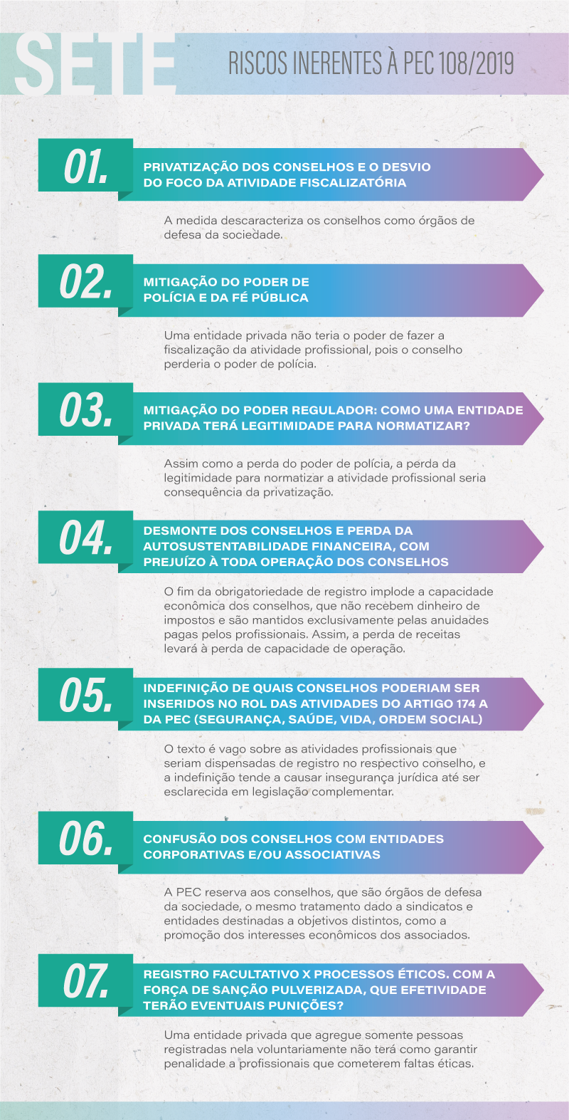 Na prática, a proposta tende a esvaziar o poder de ação dos conselhos e as suas receitas. Também não há clareza acerca de quais entidades seriam preservadas. “Isso está muito superficial no texto da PEC”, avalia o conselheiro federal. “Mesmo que entendamos que o Conselho tem função importante nas questões de segurança, saúde, vida e ordem social, depender de uma legislação complementar causa insegurança jurídica”, observa o conselheiro federal.
