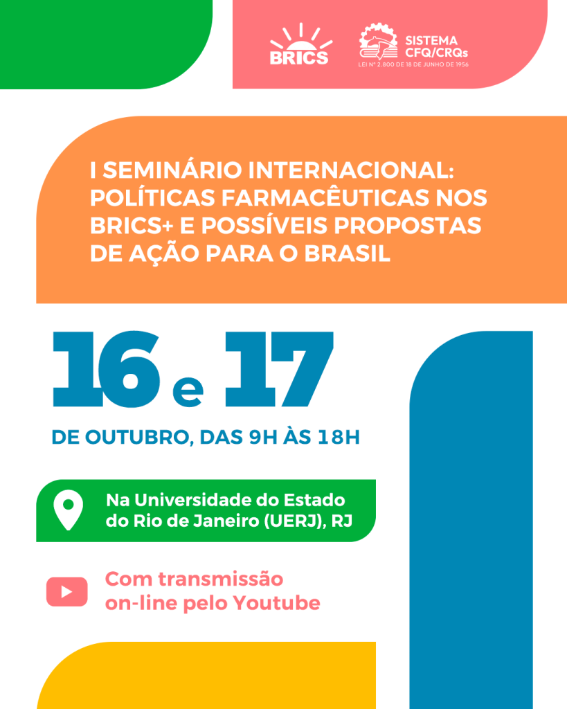 Nos dias 16 e 17 de outubro, a Fundação Oswaldo Cruz (Fiocruz) e a Universidade do Estado do Rio de Janeiro (UERJ) realizam o I Seminário Internacional com o tema “Políticas Farmacêuticas nos BRICS+ e possíveis propostas de ação para o Brasil”. O evento será realizado na UERJ, com transmissão ao vivo pelo YouTube, e reunirá especialistas de diversos países para discutir experiências e parcerias estratégicas no setor farmacêutico.