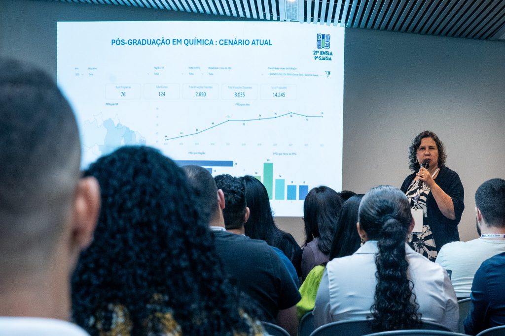 “Temos 2.650 doutores e docentes cadastrados, 8.035 discentes, uma produção científica e tecnológica em torno de 14 mil produções. Somos uma área consolidada. A área de Química é a número quatro, a Capes atualmente tem 51 áreas e o número quatro veio em ordem mesmo de criação – então é uma das áreas mais consolidadas em termos de pós-graduação. Com relação à distribuição regional, a gente percebe pelo mapa que a gente tem uma concentração grande de programas de pós-graduação de Química no Sudeste, 28 dos programas estão no Sudeste, 19 no Nordeste, 15 no Sul, 10 no Centro-oeste, apenas quatro no Norte”, afirmou Clesia.