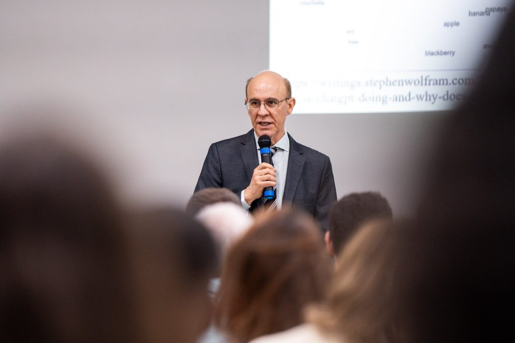 Pela manhã, a conferência “Impacto na Química de ferramentas de inteligência artificial e modelos de língua em grande escala”, ministrada por Osvaldo Novais de Oliveira Junior, do Instituto de Física de São Carlos (IFSC-USP), trouxe aos presentes um panorama sobre a inteligência artificial e sua revolução, relacionada não apenas ao domínio da ciência e tecnologia, mas também à sociedade.