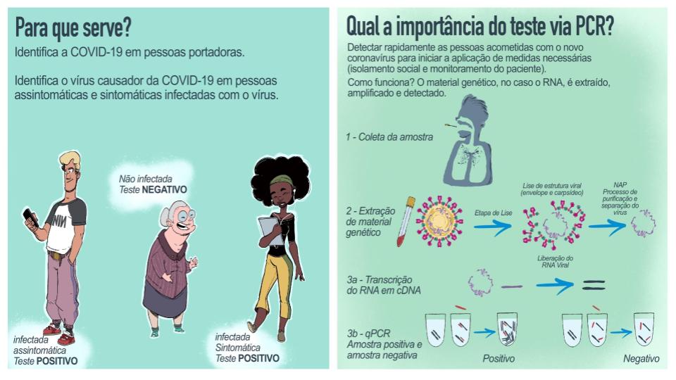 Composto por 12 figuras produzidas com recursos gráficos, o conteúdo trata, entre outros assuntos, sobre o teste PCR, um dos mais utilizados para detectar o novo coronavírus junto com os testes rápidos, que ganharam espaço no nosso cotidiano e também foram destacados no trabalho. O material completo está disponível em formato de vídeo no canal do IQSC no Youtube. Clique aqui para assistir.
