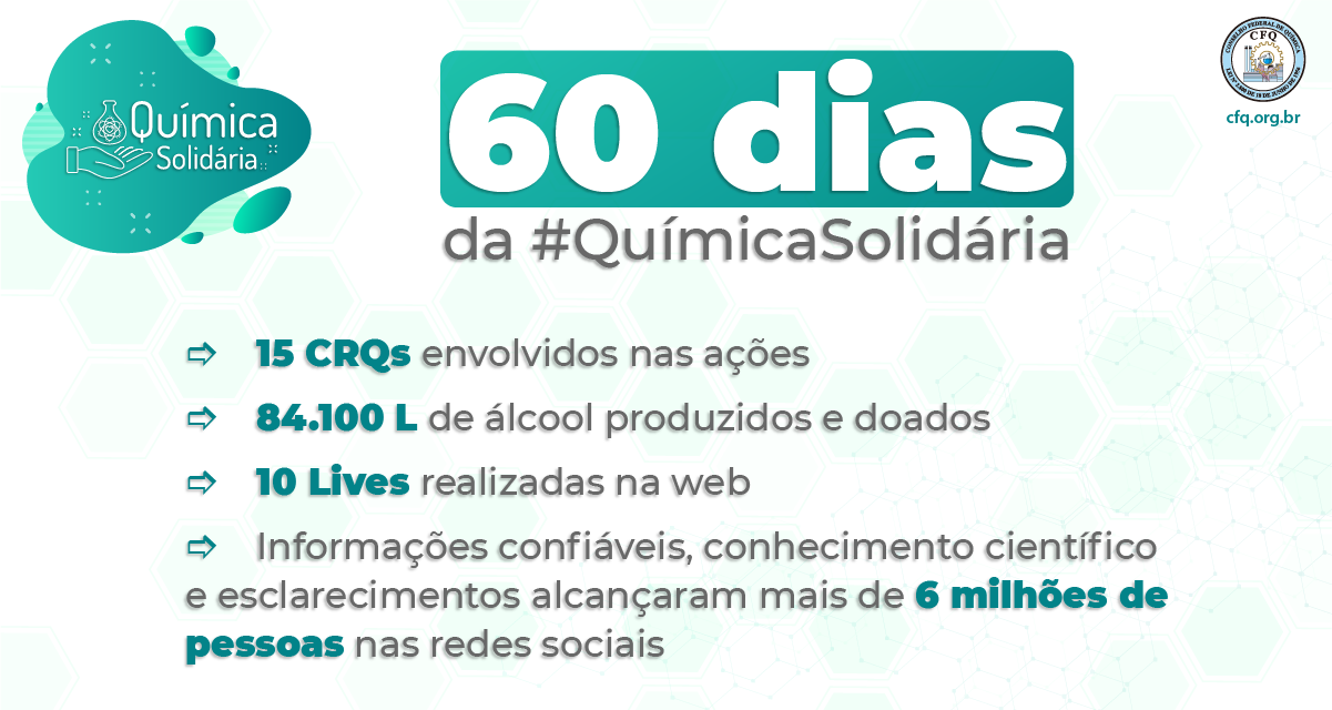 Iniciada há 60 dias, a campanha Química Solidária do Sistema CFQ/CRQs, já possibilitou até o momento a produção de 84.100 litros de álcool 70%, seja o álcool gel, o álcool líquido ou o glicerinado. Desde o começo da pandemia a iniciativa vem sendo executada em vários Estados, entre eles Alagoas, Bahia, Espírito Santo, Goiás, Minas Gerais, Mato Grosso, Pará, Paraíba, Paraná, Pernambuco, São Paulo e Rio de Janeiro.